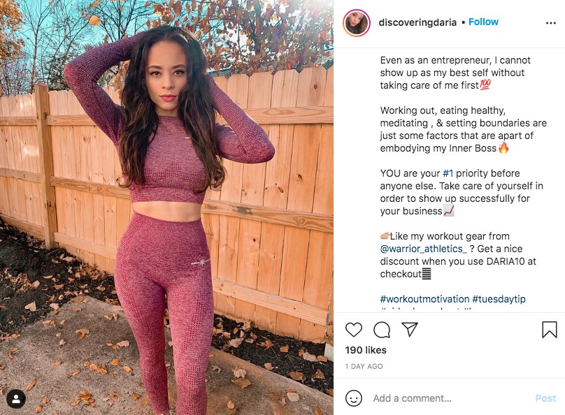 Nano influencer @discoveringdaria wearing a workout outfit from @warrior_athletics_; in the caption of her photo, notice the coupon code DARIA10, which gives her followers a discount on the brand’s website.